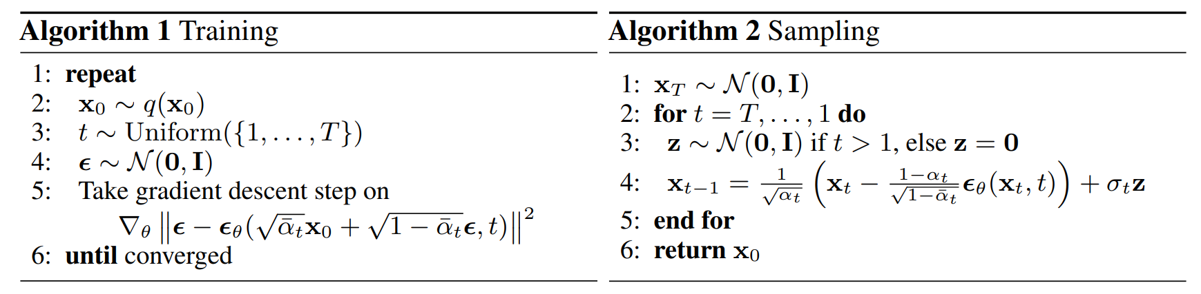 The ELBO objective involves a sum over all diffusion steps. However, computing this full sum at every training iteration would be unnecessarily expensive. Therefore, in practice, we compute only for a single time step \(t \sim \mathcal{U}\{2, \dots, T\}\), which provides an unbiased Monte-Carlo estimate of the full objective. The overall training and sampling procedures are summarized in the figure below.