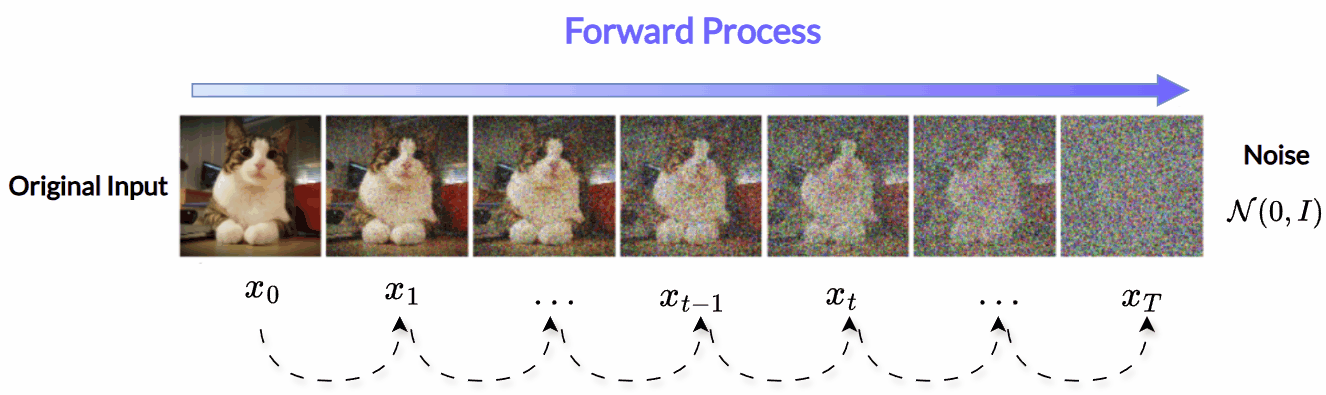 \[q(x_{t-1} \mid x_{t}, x_0) = \frac{q(x_t \mid x_{t-1}, x_0)q(x_{t-1} \mid x_0)}{q(x_t \mid x_0)}\]Step 2: The forward diffusion process