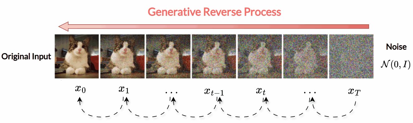 \[p_{\theta}(x_{t-1}\mid x_t) = \mathcal{N}(x_{t-1}; \mu_{\theta}, \Sigma_{\theta}),\]where \(\mu_{\theta}\) and \(\Sigma_{\theta}\) are implicitly learned via ELBO optimization. Intuitively, this model learns how to denoise \(x_t\) step by step, eventually recovering a clean sample \(x_0\).
