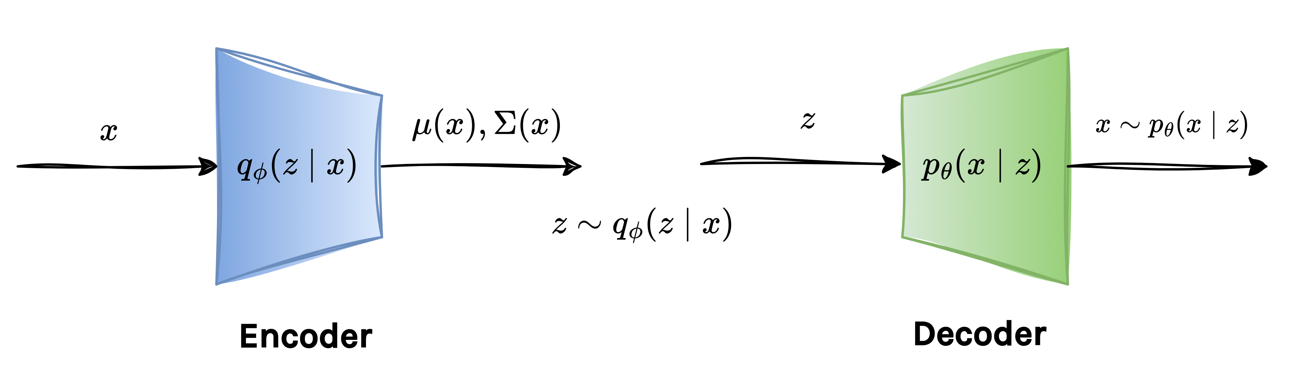 \[\begin{align} \mathcal{F}_{\theta}(q) &= \mathbb{E}_{q(z\mid x)} \bigg[\log \bigg(\frac{p_{\theta}(x\mid z)\cdot p_{\theta}(z)}{q(z\mid x)}\bigg)\bigg] \\ &= \mathbb{E}_{q(z\mid x)} [\log (p_{\theta}(x\mid z))] - \mathbb{E}_{q(z\mid x)} \log \bigg( \frac {q(z\mid x)}{p_{\theta}(z)} \bigg) \\ &= \mathbb{E}_{q(z\mid x)} [\log (p_{\theta}(x\mid z))] - \mathcal{D}_{KL}(q(z\mid x)\,\|\,p_{\theta}(z)) \end{align}\]The first term pushes the model to reconstruct the input well whereas the second pushes the posterior \(q(z\mid x)\) toward the prior. Since the true posterior is not known, we let a neural network approximate it as \(q_{\phi}(z\mid x)\). The second neural network parameterized by \(\theta\) is a decoder to model the likelihood \(p_{\theta}(x∣z)\). Together, they form the encoder–decoder pair. With this setup, training a VAE becomes the following optimization problem: