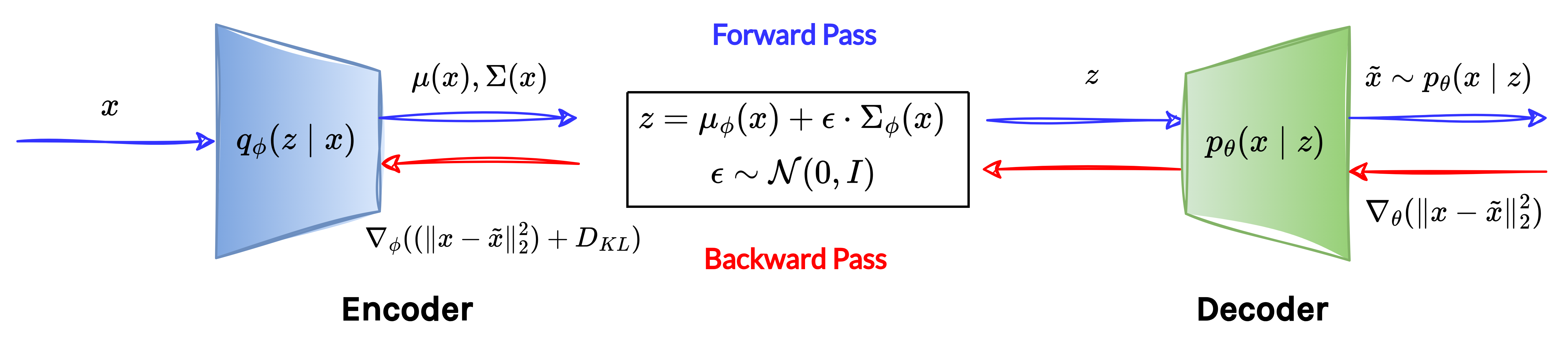 - The VAE forward pass involves sampling from the latent space, which prevents gradients from flowing through the network.